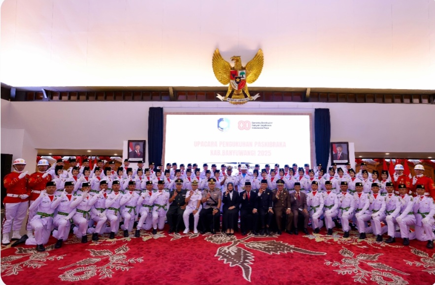 SINDOMAS, Banyuwangi – Sebanyak 75 anggota Pasukan Pengibar Bendera Pusaka (Paskibraka) dikukuhkan Bupati Banyuwangi Ipuk Fiestiandani, di Pendopo Sabha Swagata Blambangan, Jumat malam (15/8/2025). Mereka akan bertugas pada upacara peringatan HUT ke-80 Kemerdekaan RI, di Taman Blambangan, Banyuwangi, 17 Agustus 2025.