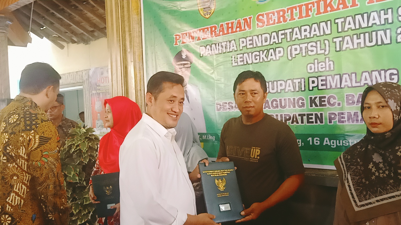Sukma.Co.id Jateng | Pemalang – Bupati Pemalang Mansur Hidayat, didampingi oleh Kepala Kantor ATR/BPN Pemalang, Bambang Bharoto, menyerahkan ribuan sertifikat Pendaftaran Tanah Sistematis Lengkap (PTSL) kepada warga Desa Pedagung, Kecamatan Bantarbolang. Sebanyak 1.250 dari total 2.740 sertifikat telah diserahkan pada acara yang digelar di Balai Desa Pedagung.