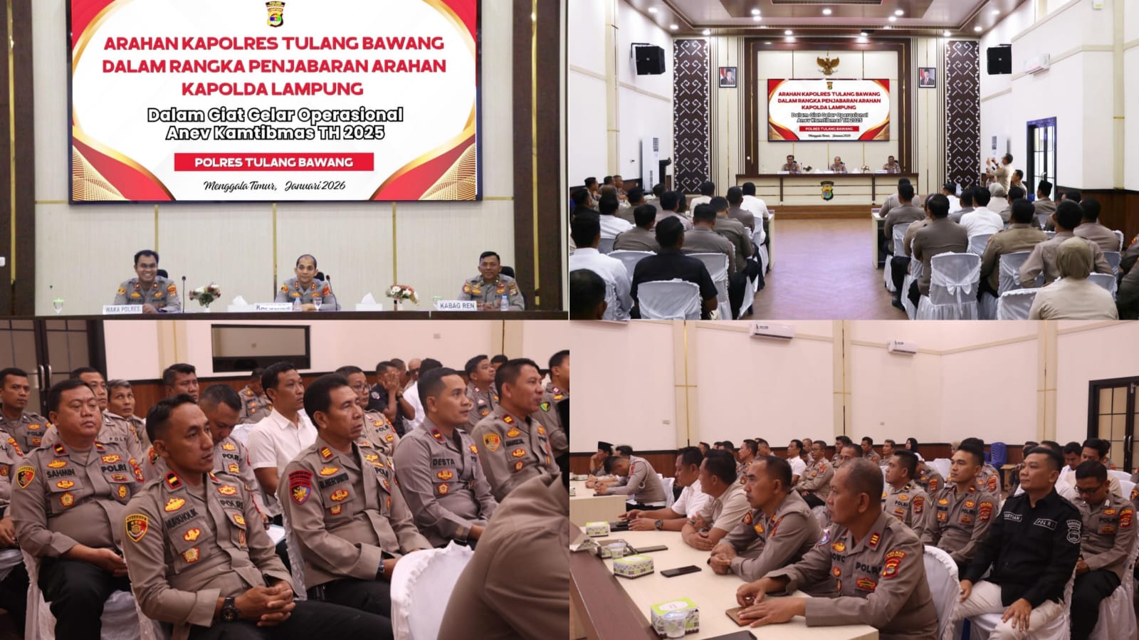 SINDOMAS, Tulang Bawang – Kepala Kepolisian Resot (Kapolres) Tulang Bawang, AKBP Yuliansyah, S.I.K., M.H., memimpin langsung kegiatan Analisis dan Evaluasi (Anev), arahan Kapolda Lampung terkait Hasil Giat Go Anev Kamtibmas Tahun 2025, digelar di Aula Wira Satya Polres Tulang Bawang, Rabu (21/1/2026). Kegiatan tersebut dilaksanakan, komitmen Polri dalam menjaga stabilitas keamanan dan ketertiban masyarakat (kamtibmas) di wilayah Provinsi Lampung kembali ditegaskan.