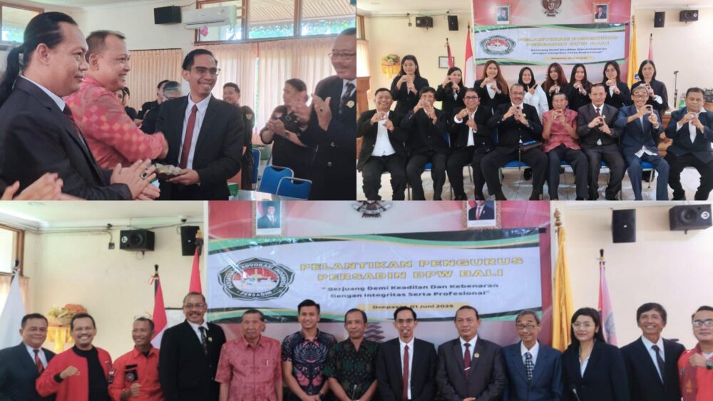 SINDOMAS, BALI –  Wakil Ketua Umum Persatuan Advokasi Indonesia (Persadin) Wilayah Timur, Lukman Afrizal, S.H., mewakili Ketua Umum Dewan Pimpinan Nasional Persatuan Advokasi Indonesia (DPN Persadin) Dr (C). KRT., Oking Ganda Miharja, S.H., M.H., melantik I Nyoman Suteja, S.H., sebagai Ketua Dewan Pimpinan Wilayah Persatuan Advokasi Indonesia (DPW Persadin) Provinsi Bali Periode 2025 – 2029 beserta jajarannya di Denpasar, Minggu (1/6/2025). Turut hadir dalam pelantikan tersebut Bendahara Umum DPN Persadin Muhammad Kholid Gani, S.H.