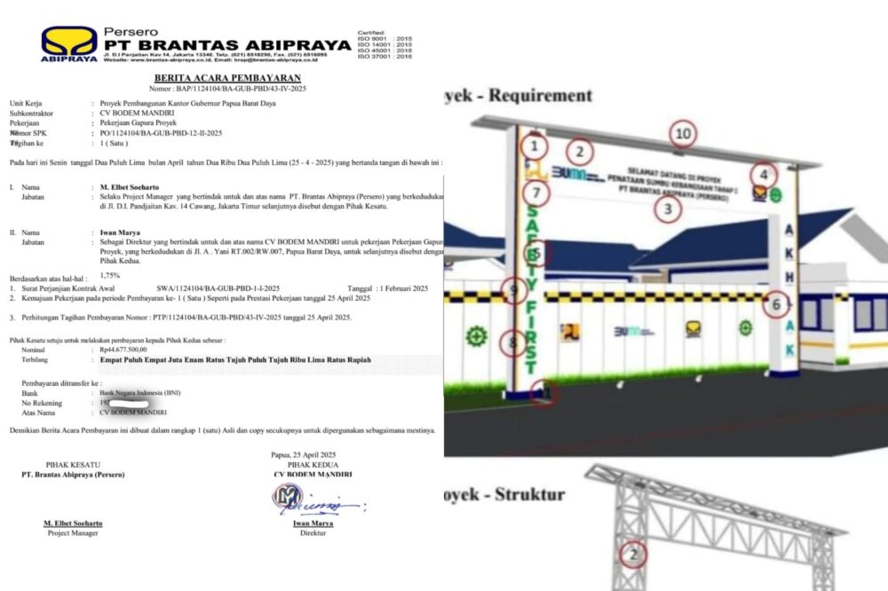 Terkait pembayaran pembuatan Gapura tersebut, Iwan Marya mengungkapkan bahwa pekerjaan tersebut sudah diselesaikannya, namun hingga sekarang pembayaran yang seharusnya diterima belum juga diberikan oleh pihak PT. Berantas Abipraya yang memberikan Surat Perintah Kerja kepadanya. “Invoice saya sudah masukkan, dan dari PT. Berantas Adipraya juga sudah membuatkan Berita Acara Pembayaran pada tanggal 25 April 2025, saya diminta tanda tangan saat itu, namun dananya belum saya terima juga hingga sekarang,” keluh Iwan.