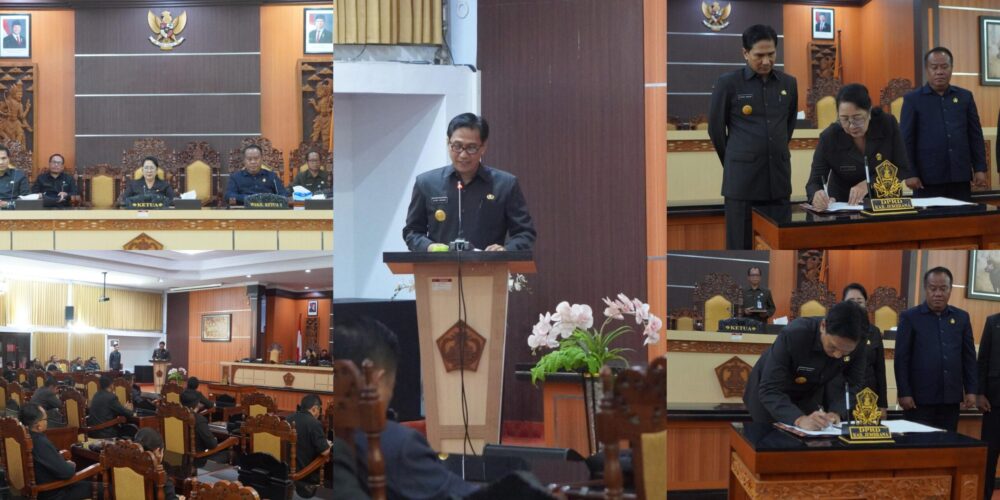 SINDOMAS, Jembrana – Penjabat sementara (Pjs) I Ketut Sukra Negara menghadiri Rapat Paripurna VI DPRD Jembrana Masa Persidangan I Tahun Sidang 2024/2025, bertempat di ruang Sidang utama DPRD Jembrana, Selasa (19/11/2024). Dalam Rapat Paripurna yang dipimpin Ketua DPRD Jembrana Ni Made Sri Sutharmi ini, anggota DPRD Jembrana dapat menyetujui Ranperda APBD Jembrana Tahun Anggaran 2025 yang kemudian dilanjutkan dengan Penandatanganan Berita Acara Persetujuan Bersama Ranperda.