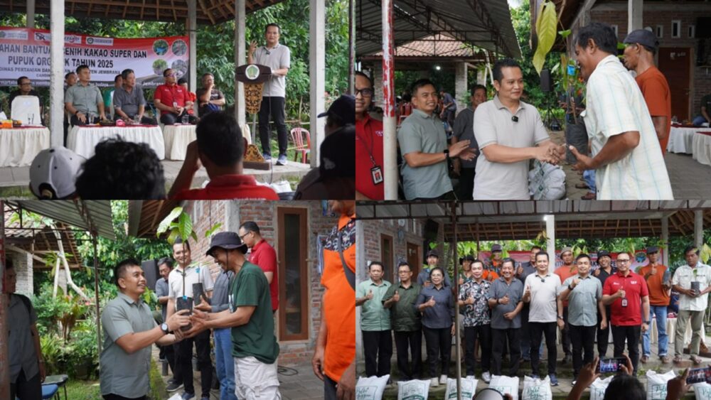 SINDOMAS, Jembrana – Bupati Jembrana I Made Kembang Hartawan didampingi Wakil Bupati I Gede Ngurah Patriana Krisna menyerahkan secara simbolis bantuan bibit kakao unggul sebanyak 19.999, dan pupuk organik sebanyak 99,9 ton kepada 8 Subak Abian dan kelompok tani di Kabupaten Jembrana, di Kelompok Tani Kakao Rastani, Banjar (Dusun) Candikusuma, Desa Candikusuma, Minggu (11/5/2025). Kakao menjadi komoditas unggulan di Kabupaten Jembrana yang mendapat perhatian khusus dari Pemkab Jembrana, mulai dari hulu sampai hilir sehingga kakao Jembrana mampu merambah pangsa pasar dunia Internasional.