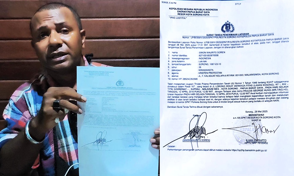 Hal tersebut disampaikan pelapor, Simon Maurits Soren, seorang warga Sorong yang sehari-hari berprofesi sebagai pengacara, kepada media ini pada Sabtu, 31 Mei 2025. “Kami telah mendatangi Mapolresta Sorong Kota dan membuat Laporan Polisi terkait dugaan tindak pidana penyerobotan tanah dengan terlapor Sdr. Paulus George Hung pada hari Rabu, tanggal 28 Mei 2025, lalu,” ungkap pria Papua yang lebih dikenal dengan sapaan Bang Simon ini.